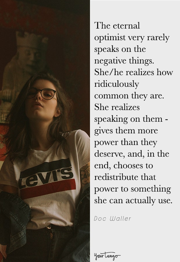 "The eternal optimist very rarely speaks on the negative things. She/he realizes how ridiculously common they are. She realizes speaking on them - gives them more power than they deserve, and, in the end, chooses to redistribute that power to something she can actually use."— Doc Waller