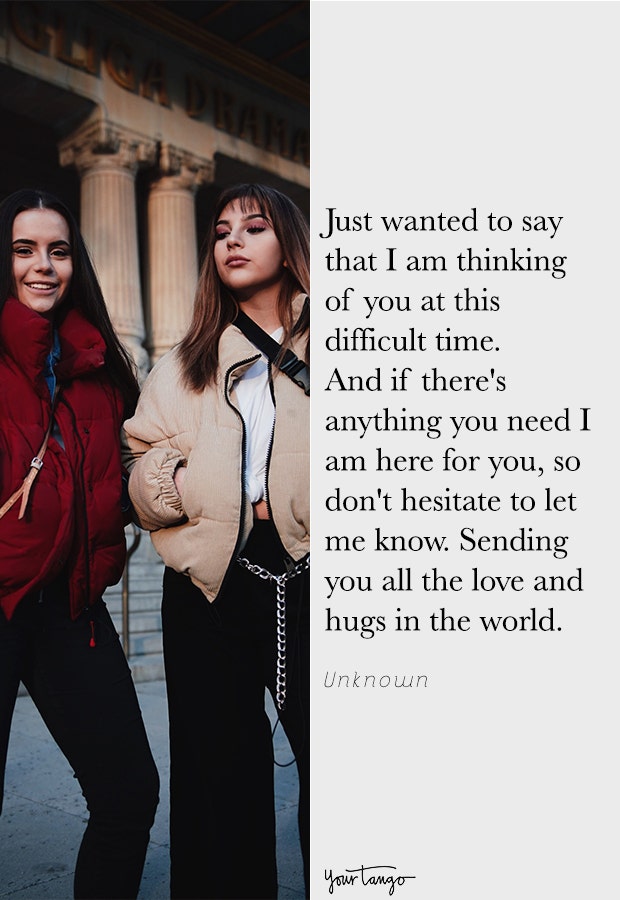 "Just wanted to say that I am thinking of you at this difficult time. And if there's anything you need I am here for you, so don't hesitate to let me know. Sending you all the love and hugs in the world."— Unknown