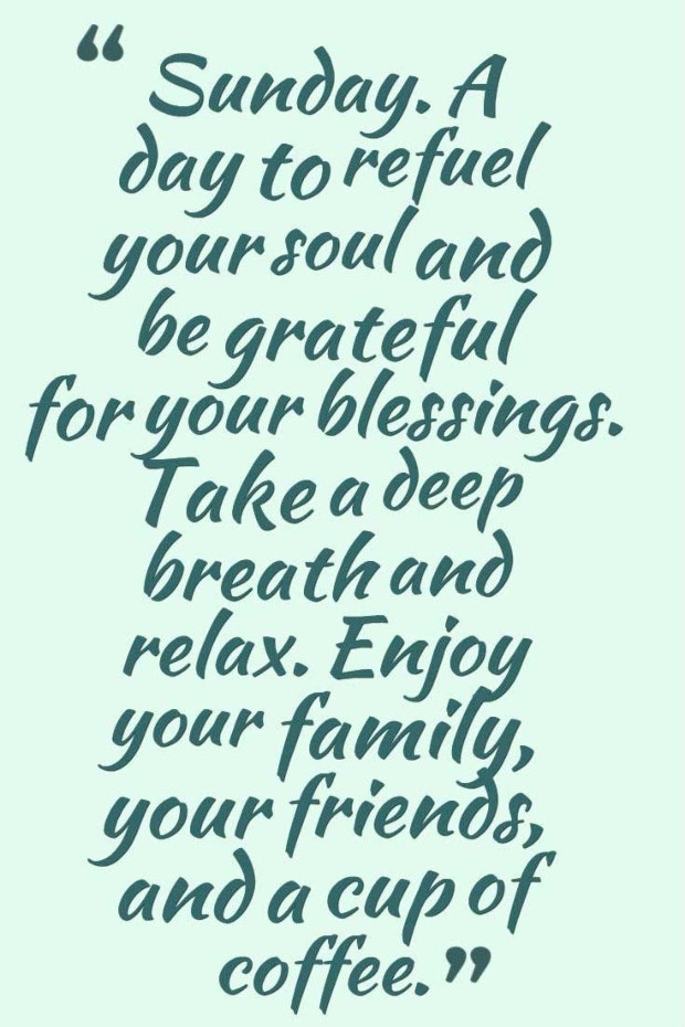 "Sunday. A day to refuel your soul and be grateful for your blessings. Take a deep breath and relax. Enjoy your family, your friends, and a cup of coffee."— Unknown