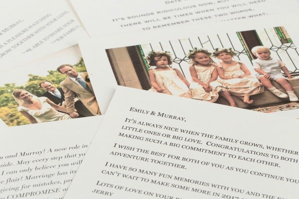 Boombox Gifts features keepsake memory boxes that are filled with custom-designed and printed personal messages and photos. All you need to do is upload memories and/or photos of the special couple to the site, and Boombox Concierge and Card Design teams take care of the design and printing.
