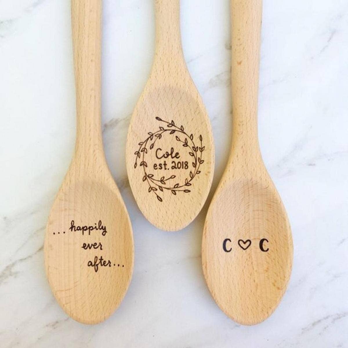 This personalized wooden spoon set includes one spoon with the couples' last name and year they were married. One spoon has the phrase "happily ever after," and one spoon gas the couples' first name initials and a little heart.