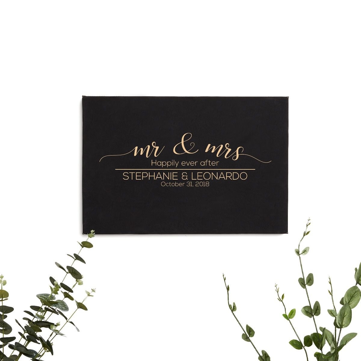 Congratulate the newly engaged couple with a gift they can use on their wedding day! This black faux leather wedding guest signature sign can be customized with the couple’s names and/or their wedding date.