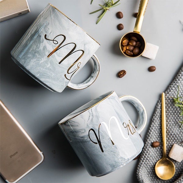 First comes the ring, then comes the congratulations, and then comes all the adorable Mr. & Mrs. home decor and dinnerware! Celebrate your friend's transition from Ms. to Mrs. with these pretty gold-trimmed marble mugs.