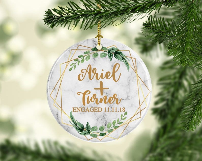 A personalized engagement ornament is the perfect keepsake for years to come. The personalized design is permanently printed on a flat, round, ceramic ornament.