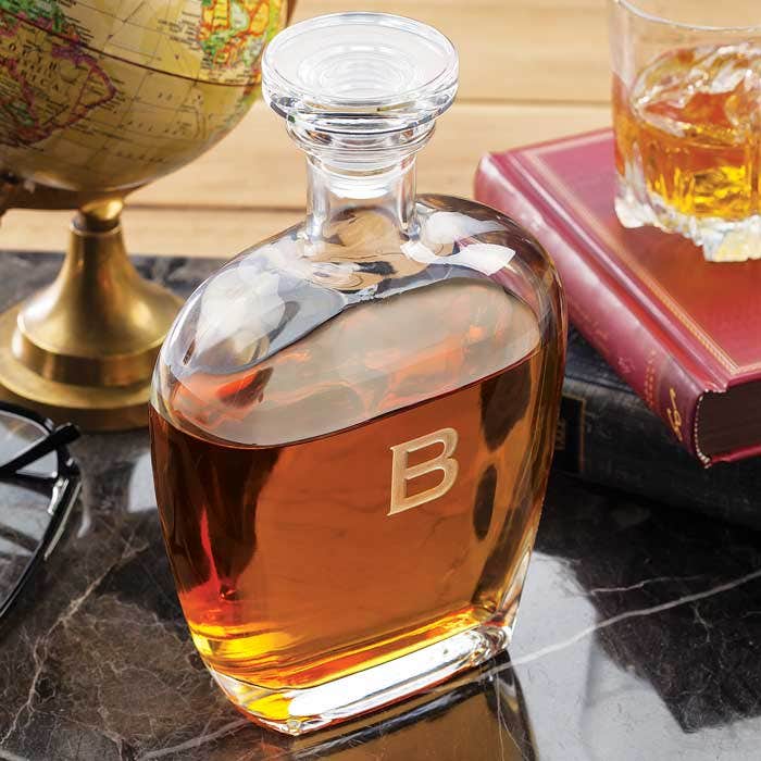 Sand etched with the initial of choice, spirits lovers will appreciate this weighty glass decanter with matching topper that adds a hint of personal style to any bar. The custom decanter holds 26 ounces and arrives ready for gifting in Olive & Cocoa gift wrap with ribbon.