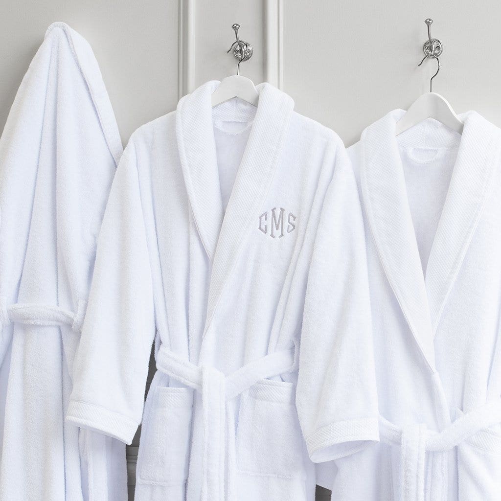 With an elegant shawl collar, turn-back cuffs and a snug waist tie for adjustable comfort, Crane & Canopy lightweight and absorbent cotton bathrobe is the softest you’ll find. Ultimate relaxation comes in three classic colors (white, grey, light grey) and can be personalized with a chic monogram.