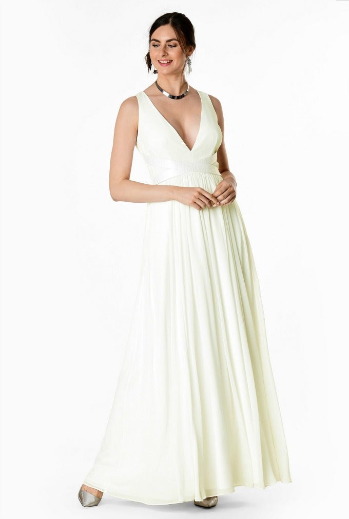 This sheer chiffon gown is ideal for a gorgeous destination wedding on the beach, since it’s effortless, flowy and light. The plunge neckline and empire waist is designed to flatter and enhance the brides natural beauty. Brides can order this dress to customized sizes for the perfect, tailored fit.