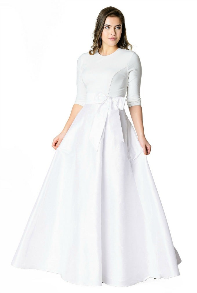 Fit for a princess, this gown brings all of the glamour and poise that the modest bride is looking for. With a jewel neckline and three quarter length sleeves, the only thing that makes this gown better is that it can be ordered to the bride’s exact measurements for a custom fit.