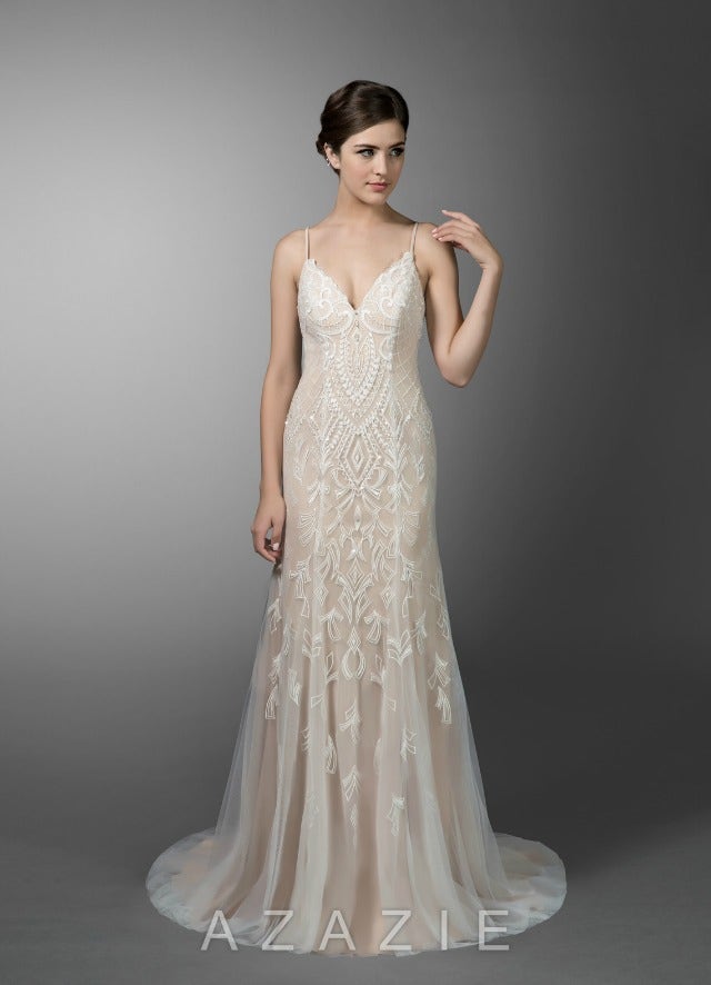 This mermaid shaped silhouette is crafted in two layers of fine tulle embroidered with an Art Deco inspired design and hand beaded. The low-cut sweetheart neckline is finished with thin delicately beaded shoulder straps. The nude lining makes the graphic pattern eye-catching and alluring.