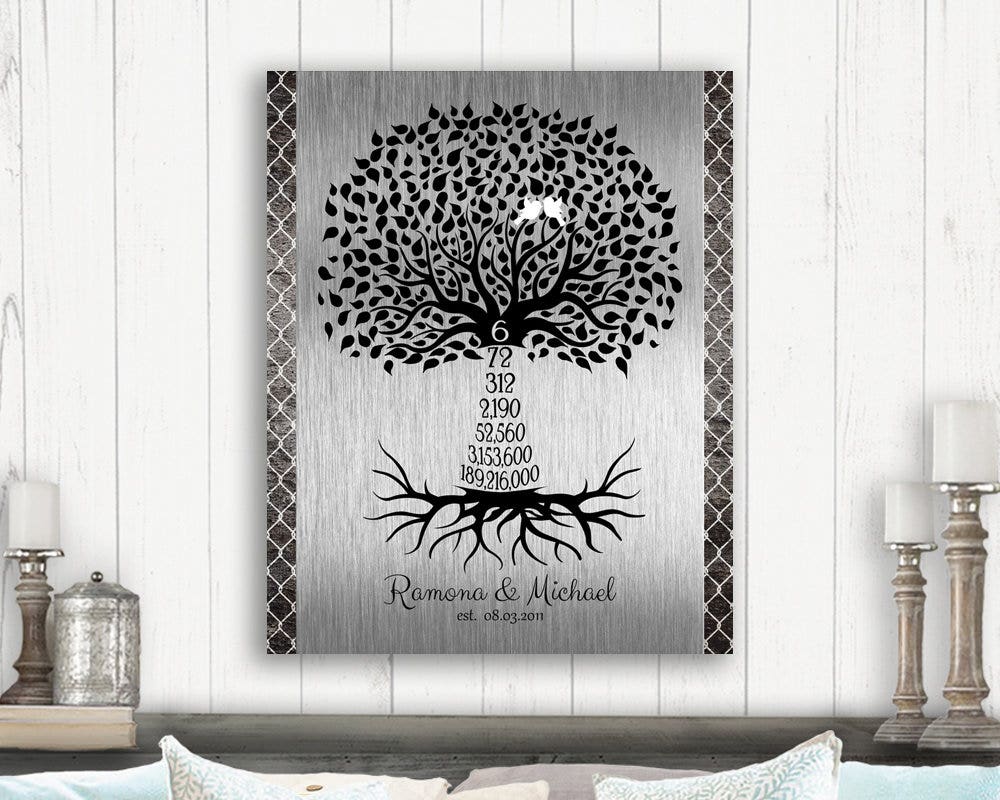 Created with a faux iron styled background, this custom piece includes an original Lucky Tusk countdown tree trunk of years, months, weeks, days, hours, minutes and seconds. Second to none, this piece makes an outstanding and meaningful keepsake gift to mark your 6th anniversary together.