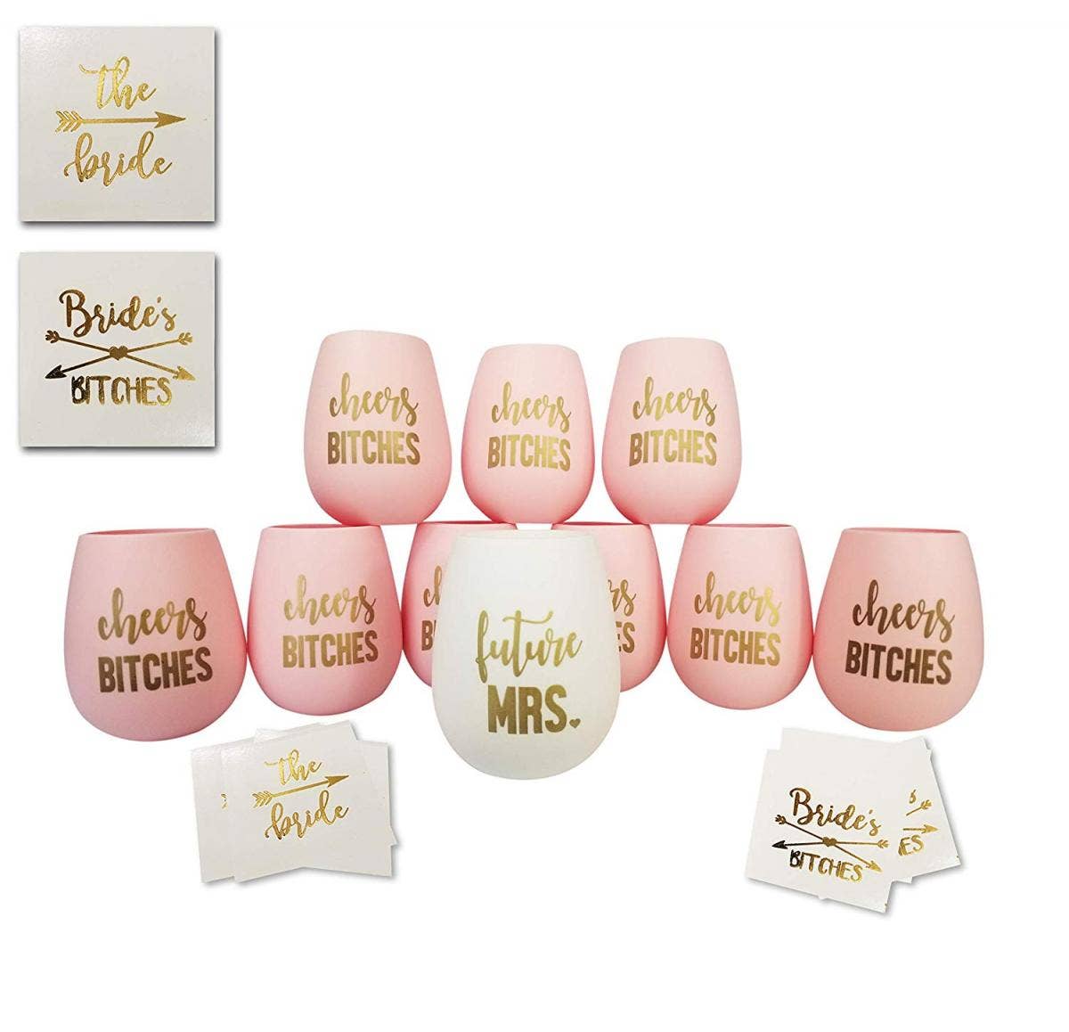 The Future Mrs./Cheers B****es silicone wine glasses set comes in a very fashionable pale pink/gold. These glasses will be one of the coolest arrangement features and will make an ideal keepsake for the bridesmaids.