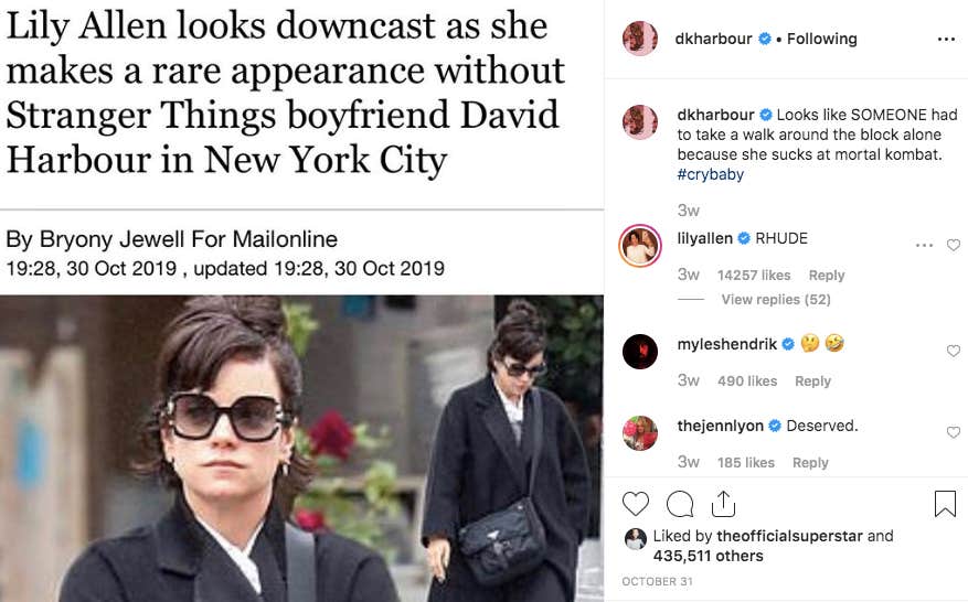 Harper's Bazaar did us all the favor and broke down the relationship timeline between Lily Allen and David Harbour. In January of this year, Allen announced she was "single" for the first time since she was 15 years old after breaking up with DJ Meridian Dan.