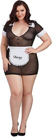 This incredibly sexy, plus-size maid-themed stretch mesh chemise features a collar and sleeves with ruffled lace details.