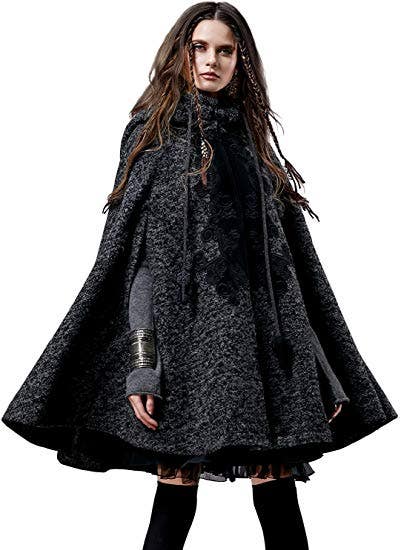 Big hood with drawstring tie, made with heavy and thick wool blend fabric, full body coverage with length above the knee, vintage embroidery on the front chest, drop shoulder with two hand openings, no sleeve design, and comes in grey/black and oliver green color.