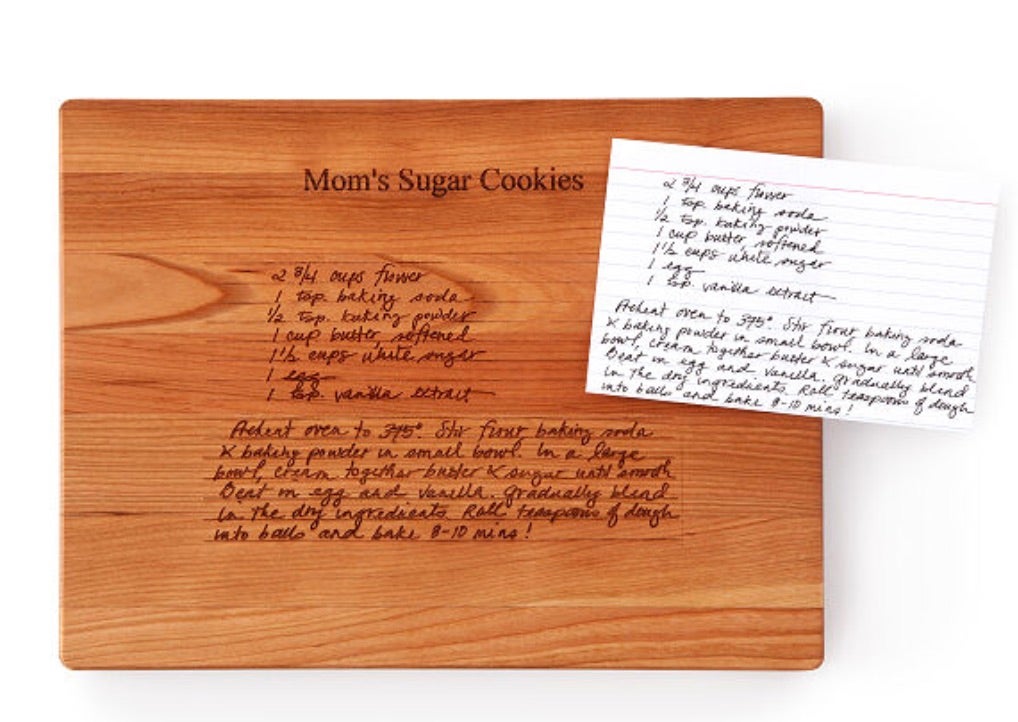 Submit a scanned image of a family recipe card, and the exact directions are etched in your loved one's handwriting. If you don't have the card, you can enter a typed recipe and it'll be etched it in a lovely script that feels handwritten.