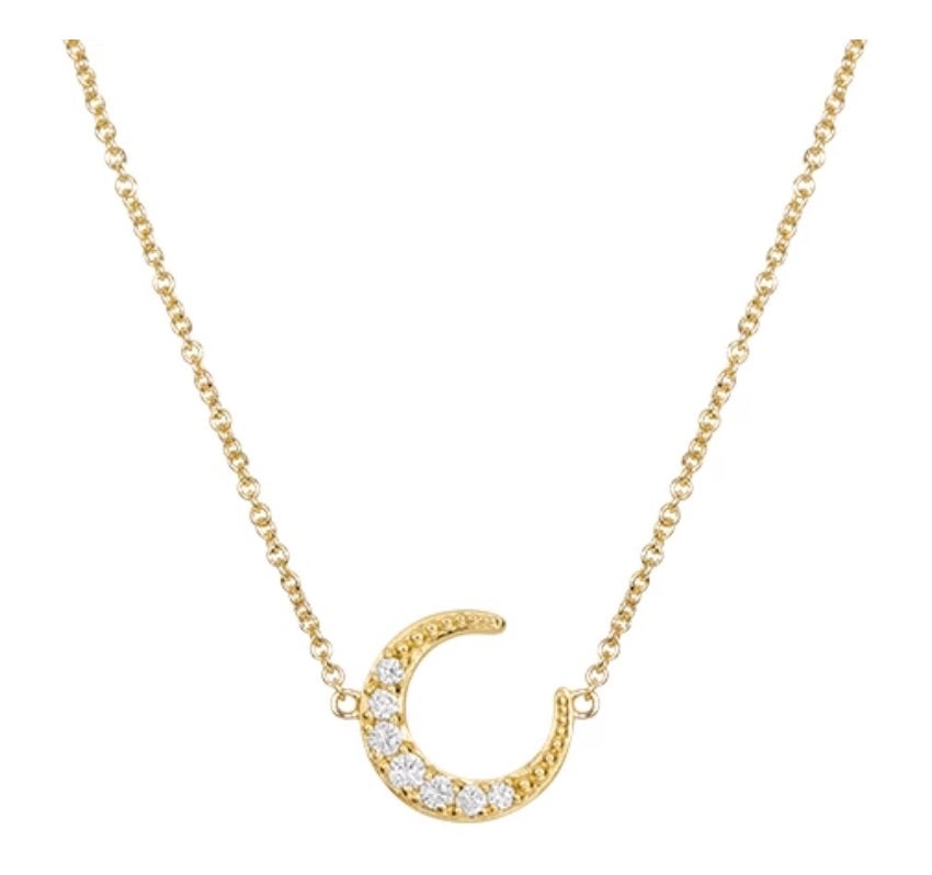 Do you love her to the moon and back? Show her with this stunning celeste necklace from Elizabeth Stone. A sparkling crescent moon enhances this delicate necklace the perfect thoughtful gift this year.