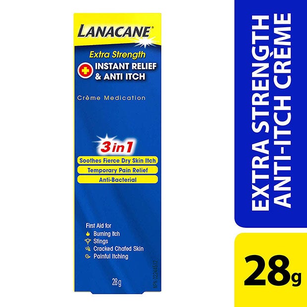 Lanacane Maximum Strength Anti-Itch Cream provides fast-acting itch relief from insect bites, rashes, and dry skin. Lanacane includes active ingredients Benzethonium chloride 0.2 percent (First-Aid Antiseptic) and Benzocaine 20 percent (Pain Relief Cream). It provides quick relief while killing germs and cooling instantly.