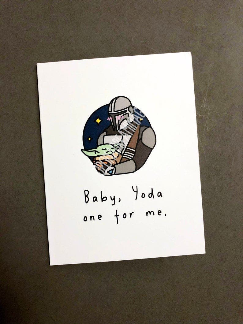 Do you and your partner love watching Disney+ and all things Star Wars? Celebrate that television show you have in common with this adorable and funny "Baby, Yoda one for me." Mando would approve.