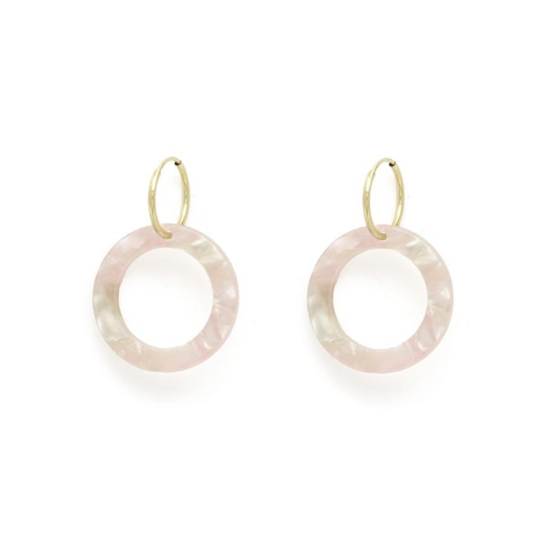 Handmade in Los Angeles, these gold-filled endless hoop earrings with a pink resin acetate circle look good on anyone.
