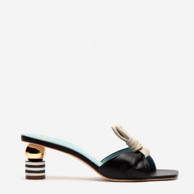 Have you ever seen a snazzier heel for summer? We think not! Featuring a sculptural "kick ball" heel and shiny Napa leather — all topped with a bow — this is not your average mule. It's a party mule!