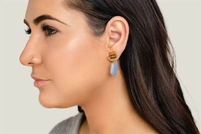 Designer Sarah E. Kaplan's stunning earring line was established from her desire to create bold, singular jewelry designed to not only highlight the natural elements that form them, but more importantly — to offer pieces of wearable art. This pair is 14K gold plated with blue agate.