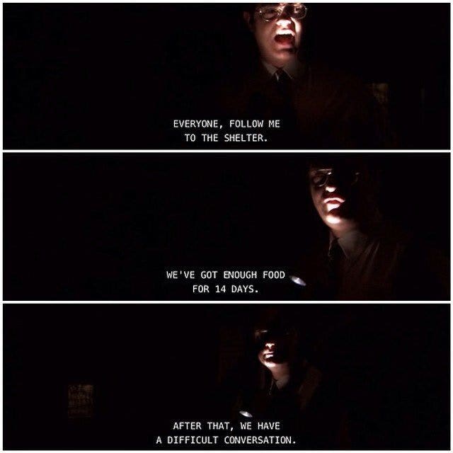 44. “Everyone, follow me to the shelter. We’ve got enough food for 14 days. After that, we have a difficult conversation.”
