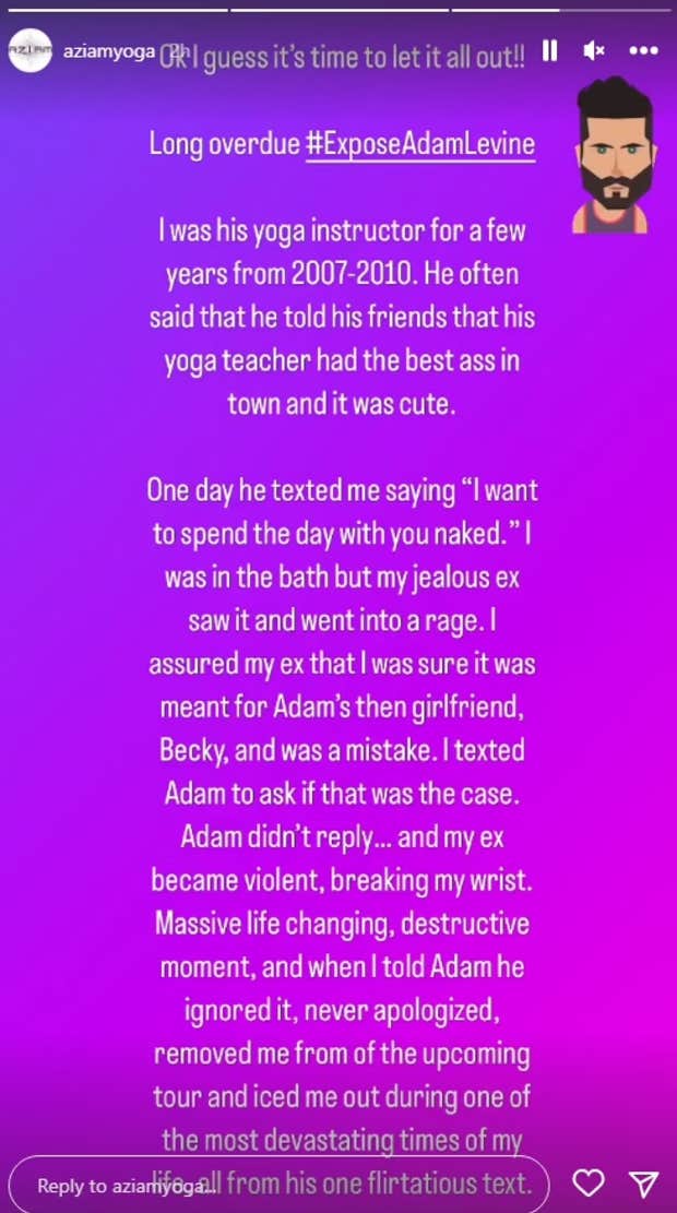 Adam Levine's Former Yoga Teacher Claims Flirty Text He Sent Her Led To Most ‘Devastating’ Time In Her Life