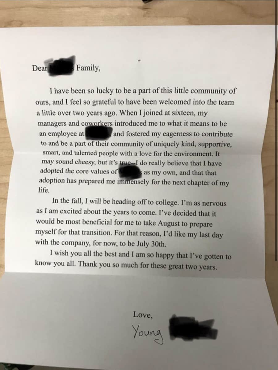 “I have been so lucky to be a part of this little community of ours, and I feel so grateful to have been welcomed into the team a little over two years ago,” the letter reads. “When I joined at sixteen, my managers and co-workers introduced me to what it means to be an employee at [name of workplace] and fostered my eagerness to contribute to and be a part of their community of uniquely kind, supportive, smart, and talented people with a love for the environment.”
