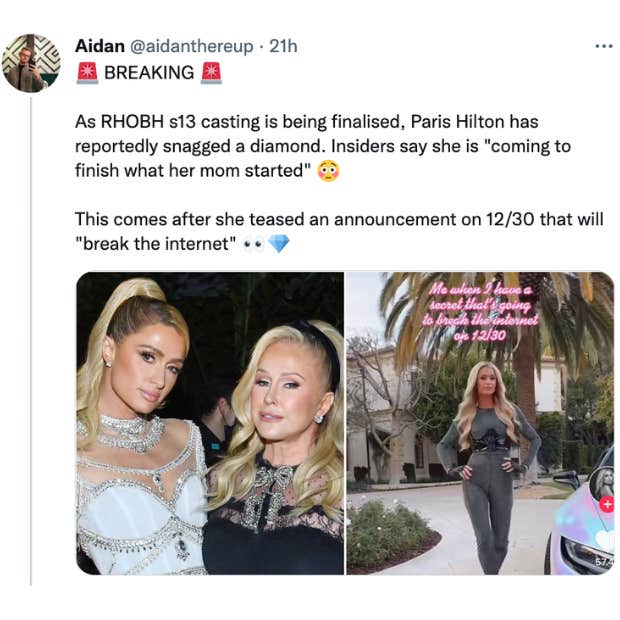 It seems to be Twitter user @aidanthereup's tweet that set tongues wagging about Hilton joining "RHOBH" to avenge her mother.