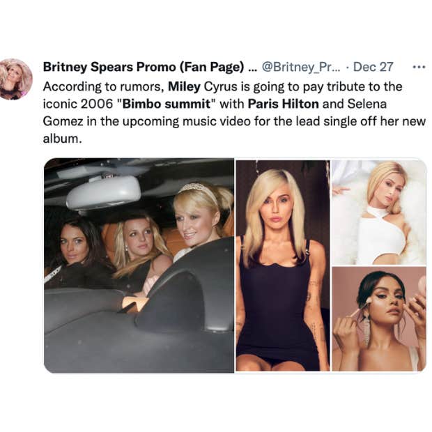 She's rumored to be appearing in Miley Cyrus's long-awaited comeback music video in a recreation of the infamous 2006 so-called "Bimbo Summit" between Hilton, Lindsay Lohan and Britney Spears.