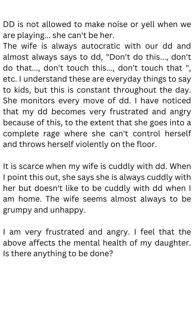 Additionally, their daughter is not to make any noise while she is having playtime, per her mother’s rules. “She can’t be herself,” her father says. “The wife is always autocratic with our dd and almost always says to dd, ‘Don't do this..., don't do that..., don't touch this..., don't touch that,’ etc… I understand these are everyday things to say to kids, but this is constant throughout the day. She monitors every move of DD.”
