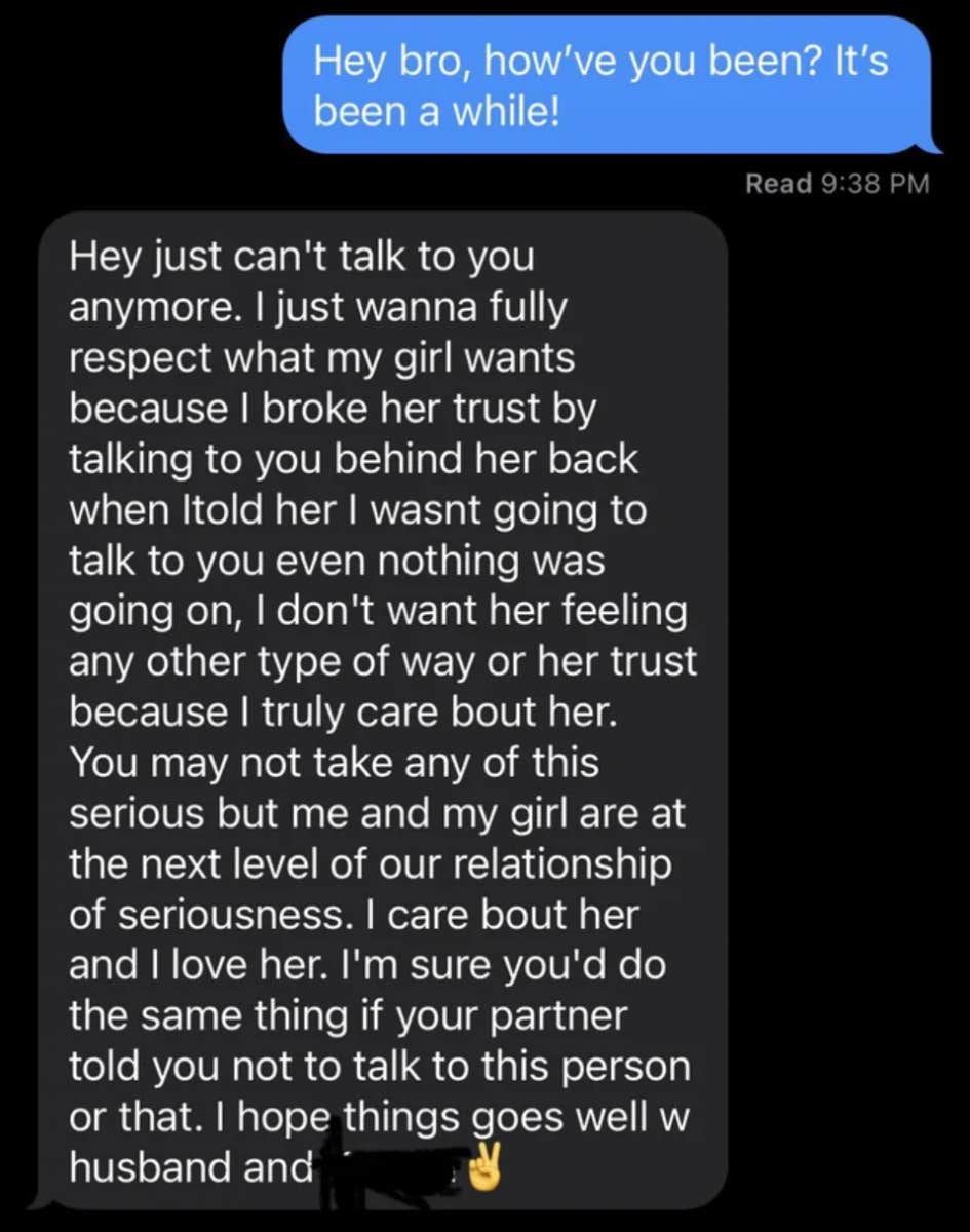 Someone in the comments raised the question of whether or not this was actually her friend writing the text, and her reply may have raised even more concerns. She said, “The way it was worded sounds like him, but not the way he thinks. She 1000% was over his shoulder telling him what to say.”