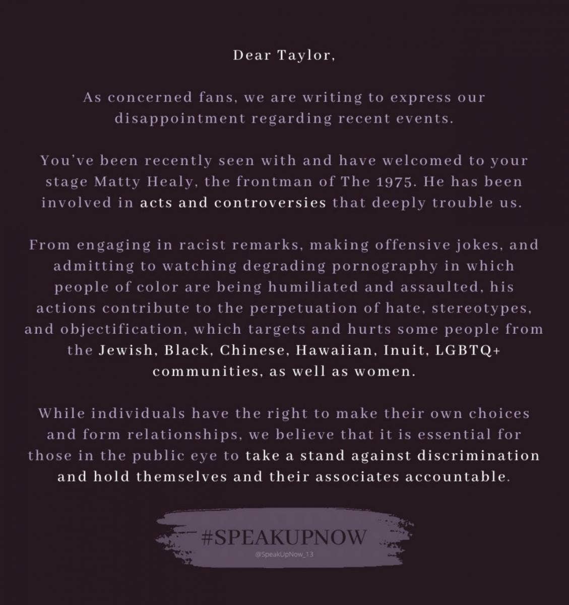 While it’s absolutely true that Swift isn’t responsible for the problematic, toxic worldview Healy openly expresses, it’s also true that she’s a grown woman with massive amounts of privilege and power. Swift made the decision to date a musician with a documented history of weaponizing his own privilege, by speaking inflammatory cultural commentary on one side of his mouth, then declaring how little what he says matters on the other. When asked by The New Yorker this week if he baits his fans, Healy said he did, sometimes, then said, “But it doesn’t actually matter.”