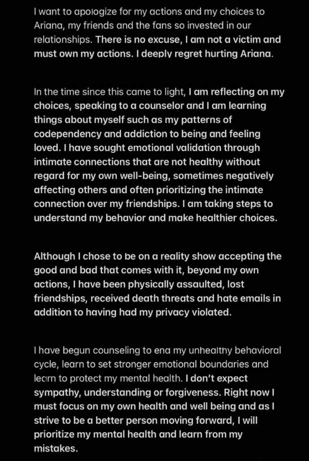 "I want to apologize for my actions and my choices foremost to Ariana, and to my friends and the fans so invested in our relationships. There is no excuse, I am not a victim and I must own my actions and I deeply regret hurting Ariana," Leviss wrote on Instagram.