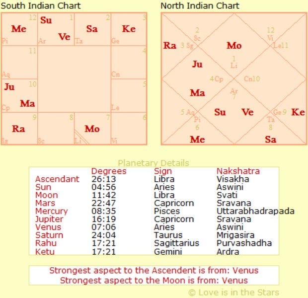 - You will see two charts which are the same but shown in different formats — the one on the left is the South Indian format and the one on the right is the North Indian