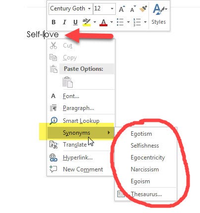Here’s what I get when I look up self-love synonyms in Microsoft Word 2016: