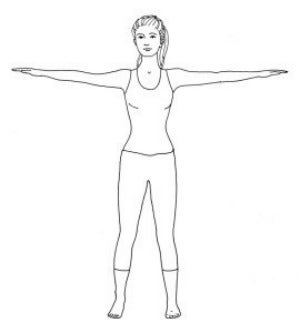Stand with your arms outstretched and horizontal to the floor, palms facing down. Align your arms and shoulders. Your feet should be shoulder-width apart.