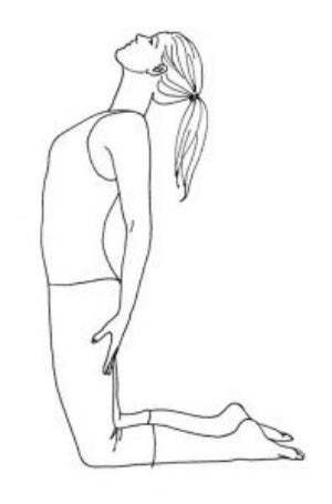 Kneel on the floor with your toes curled under your feet. Place your hands on the backs of your thighs. Slide your hands down your thighs and draw your shoulders back.