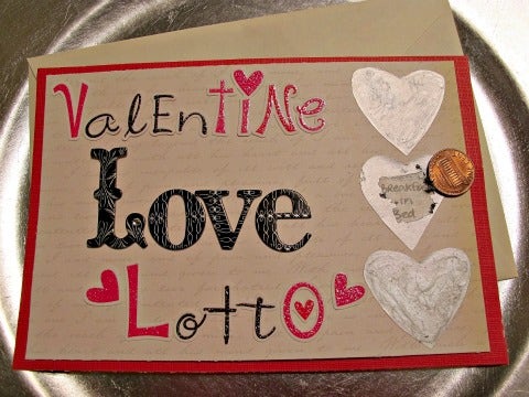 - While this is drying, create your card. Take that heart template you cut out and LIGHTLY trace where you want your scratch offs and then design the rest of your card around it. Inside of each soon to be scratch off, write what your Valentine will "win." After it is all done, erase the hearts.