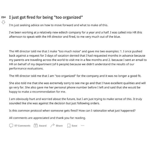 Employee Says He Was Suddenly Fired After Being Told By HR That He Was 'Too Organized' For The Company