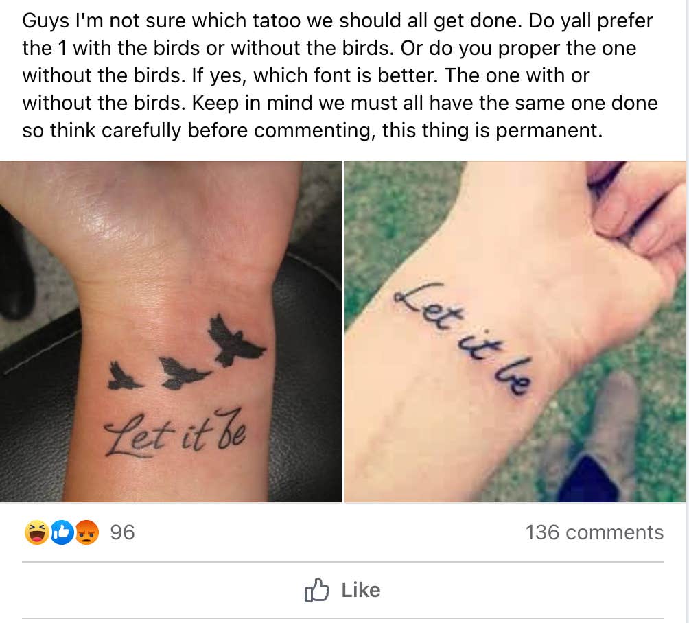 "We must all have the same one done so think carefully before commenting, this thing is permanent," they wrote, asking users to chose a tattoo.
