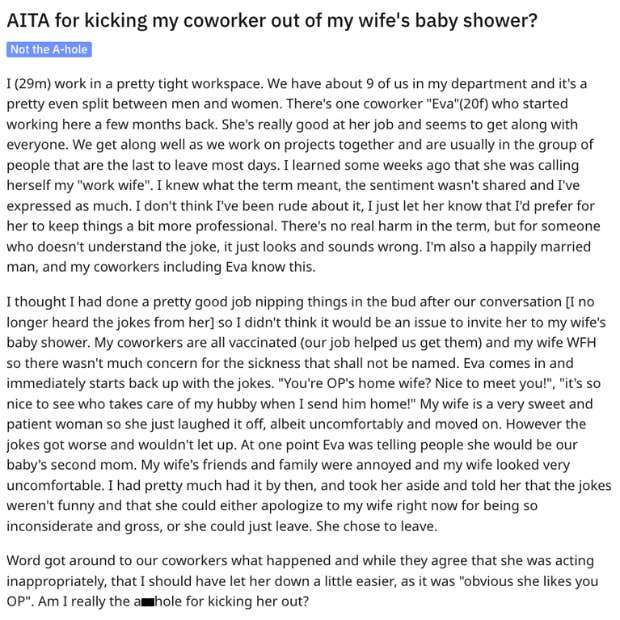 Cole writes that since Eva's jokes had stopped at work, he thought she'd gotten the point, "so I didn't think it would be an issue to invite her to my wife's baby shower." He was instantly proven wrong pretty much from the moment Eva walked in the door. "Eva comes in and immediately starts back up with the jokes. 'You're OP's home wife? Nice to meet you!'"