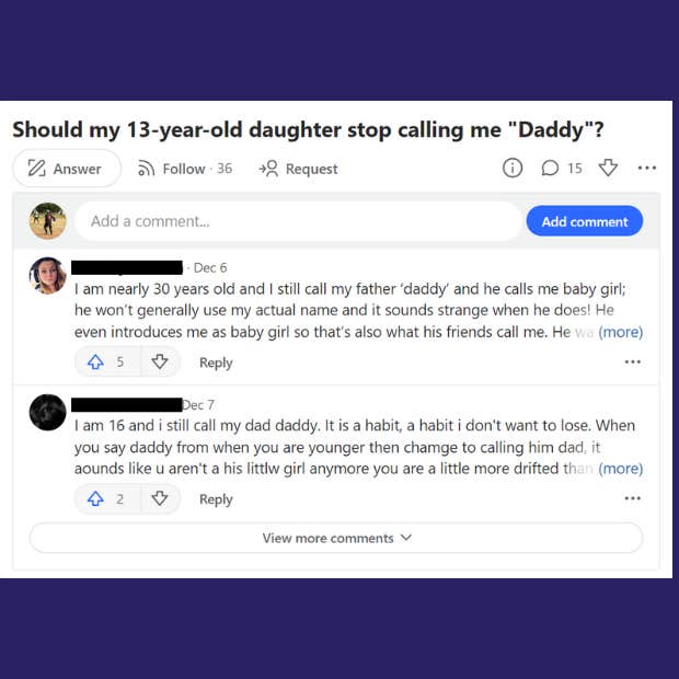 The post got right to the point, asking, “Should my 13-year-old daughter stop calling me 'Daddy?'” Readers quickly shut down the idea of doing so with the first person writing, “I am nearly 30 years old, and I still call my father ‘daddy’ and he calls me baby girl; he won’t generally use my actual name and it sounds strange when he does! He even introduces me as baby girl so that’s also what his friends call me. He was my only parent for my entire life, and we have a very strong bond. I see nothing wrong with a daughter calling her father ‘daddy’. Maybe because I do it. But in my opinion, it’s only weird if you make it weird.”
