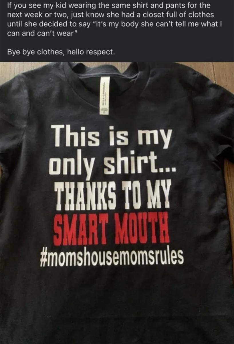 “Bye bye clothes, hello respect,” reads the end of the post. This confession to authoritative parenting was followed by a photo of the t-shirt mentioned, that read “This is my only shirt…Thanks to my smart mouth. #momshousemomsrules.”