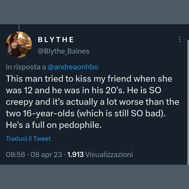 One woman, Blythe Baines, posted to Twitter and claimed, “This man tried to kiss my friend when she was 12 and he was in his 20s. He is so creepy and it’s actually a lot worse than the two 16-year-olds (which is still so bad). He’s a full on pedophile.”