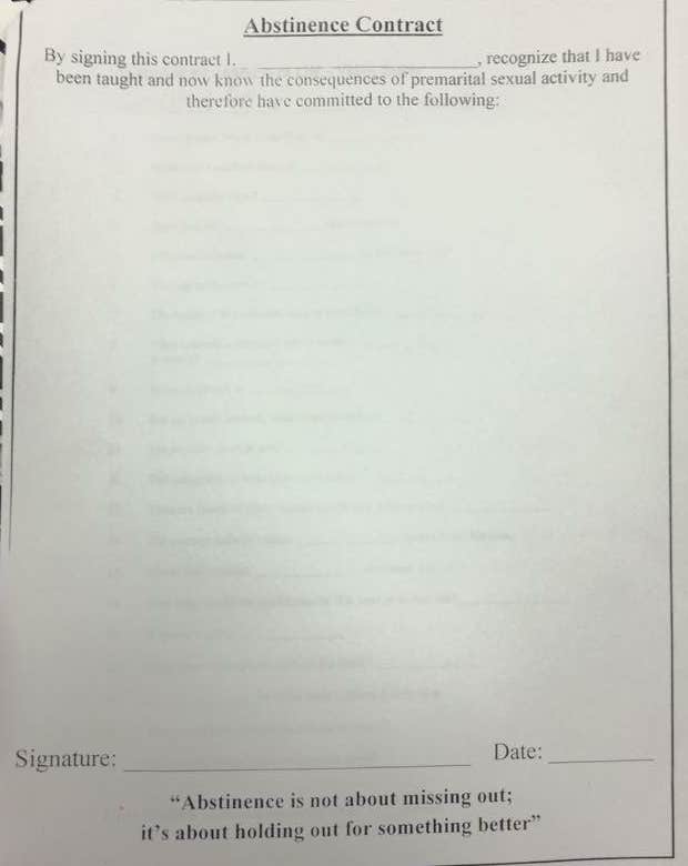 The second sheet that was sent home with these students was a contract. For homework, they were expected to sign a pledge not to have premarital sex. Again, this is at a public high school, not an evangelical Christian purity ball.