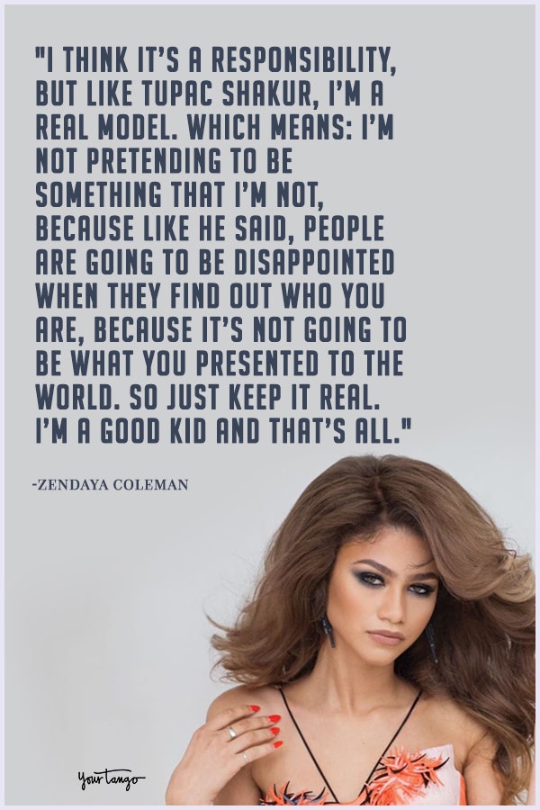 "I think it’s a responsibility, but like Tupac Shakur, I’m a real model. Which means: I’m not pretending to be something that I’m not, because like he said, people are going to be disappointed when they find out who you are, because it’s not going to be what you presented to the world. So just keep it real. I’m a good kid and that’s all."— Zendaya
